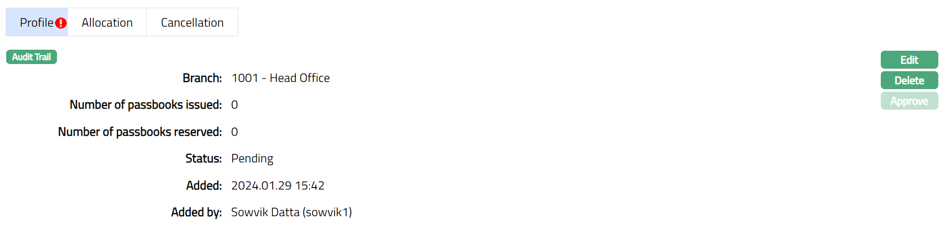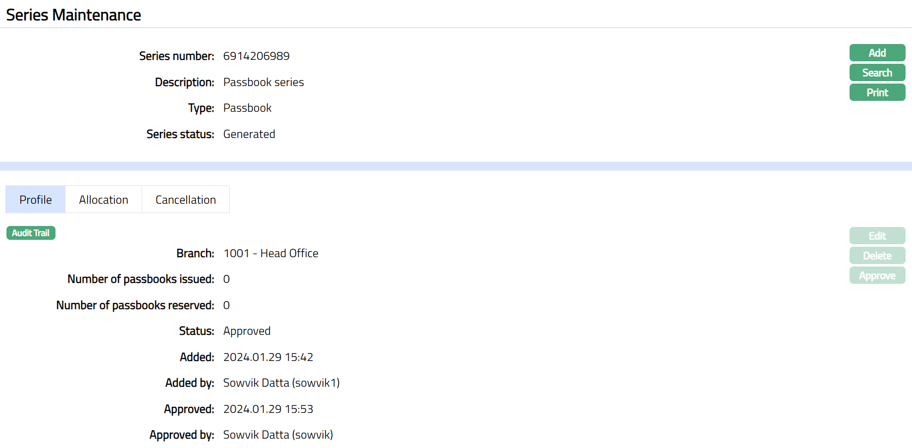 When the record is created and status is Initiated, any user other than the one who created the record can Approve this record. Once Approved, status of the passbook series is updated to Generated and record status is Approved. You can edit the record until this stage.