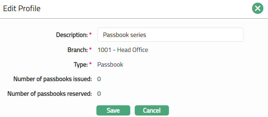 Number of passbooks reserved: It denotes the number of passbooks in reserved status. By default, the value is Zero. It displays the Number of passbooks which have passbook status as issued and Record status as Pending.