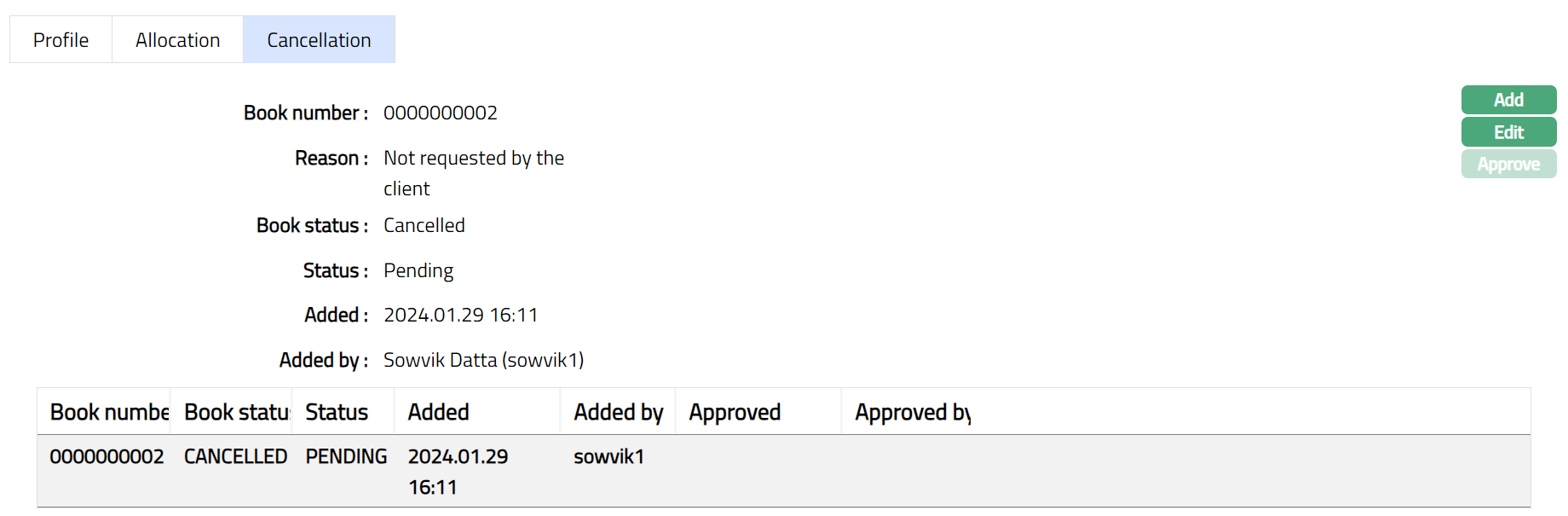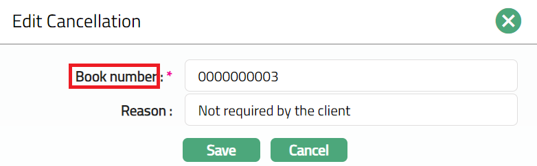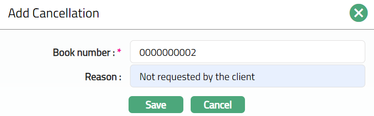 Cancellation tab allows you to cancel the required passbooks allocated to the client. It also displays the book number which is deleted.