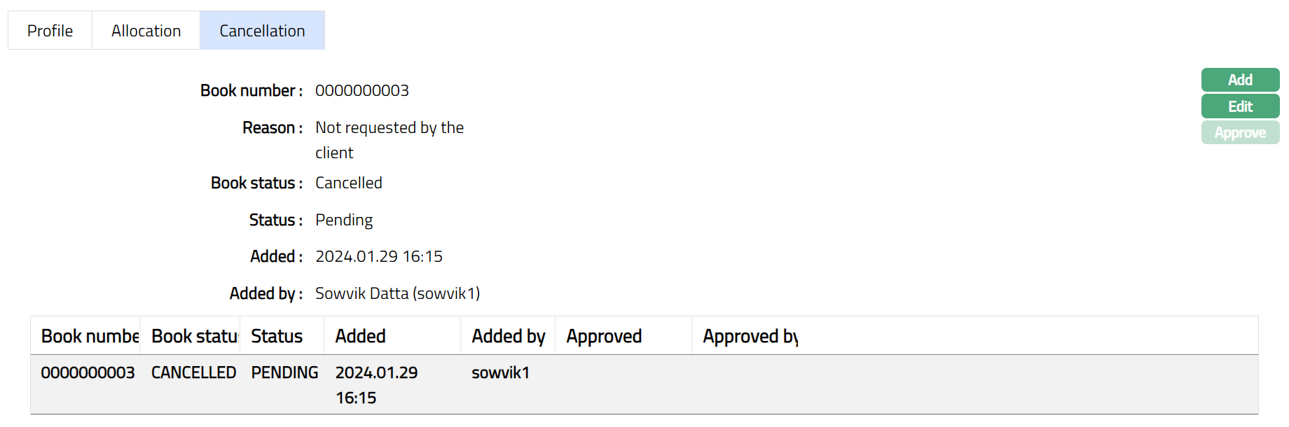 - Click Add. Add Cancellation page appears.