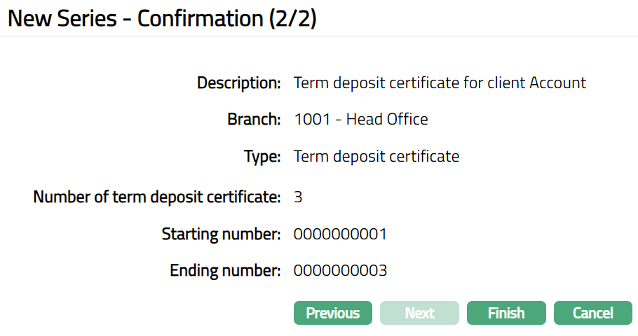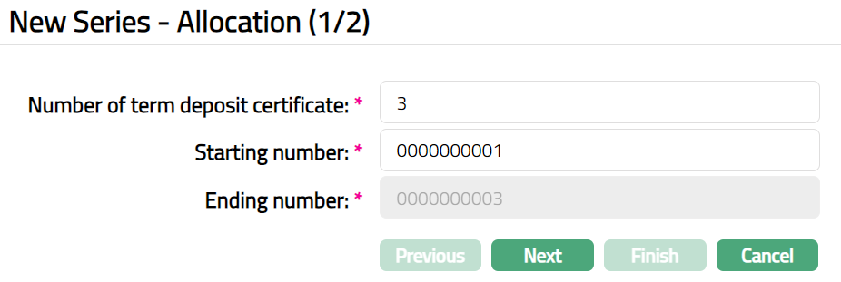 Example: If Starting number is 0000000001 and the number of Term deposit certificate entered is 25, then Ending number will display 00000000025 (00000000001 + 25 -- 1 = 0000000025).