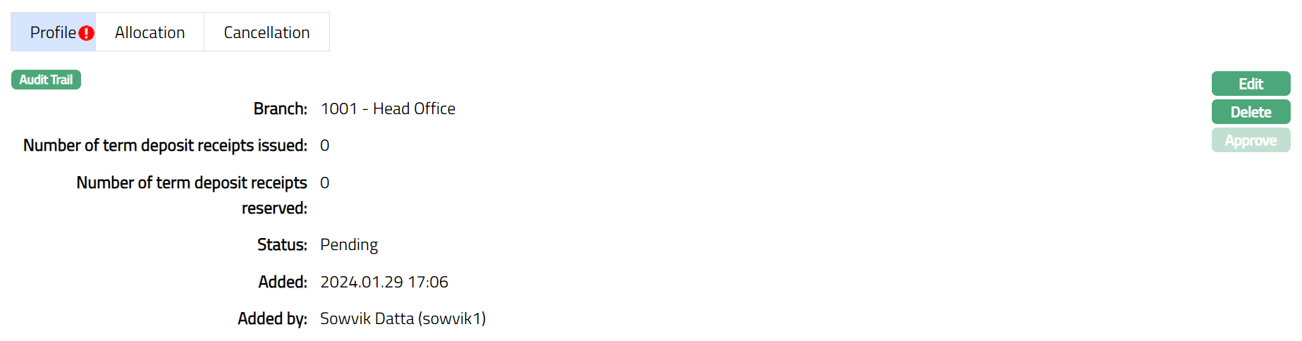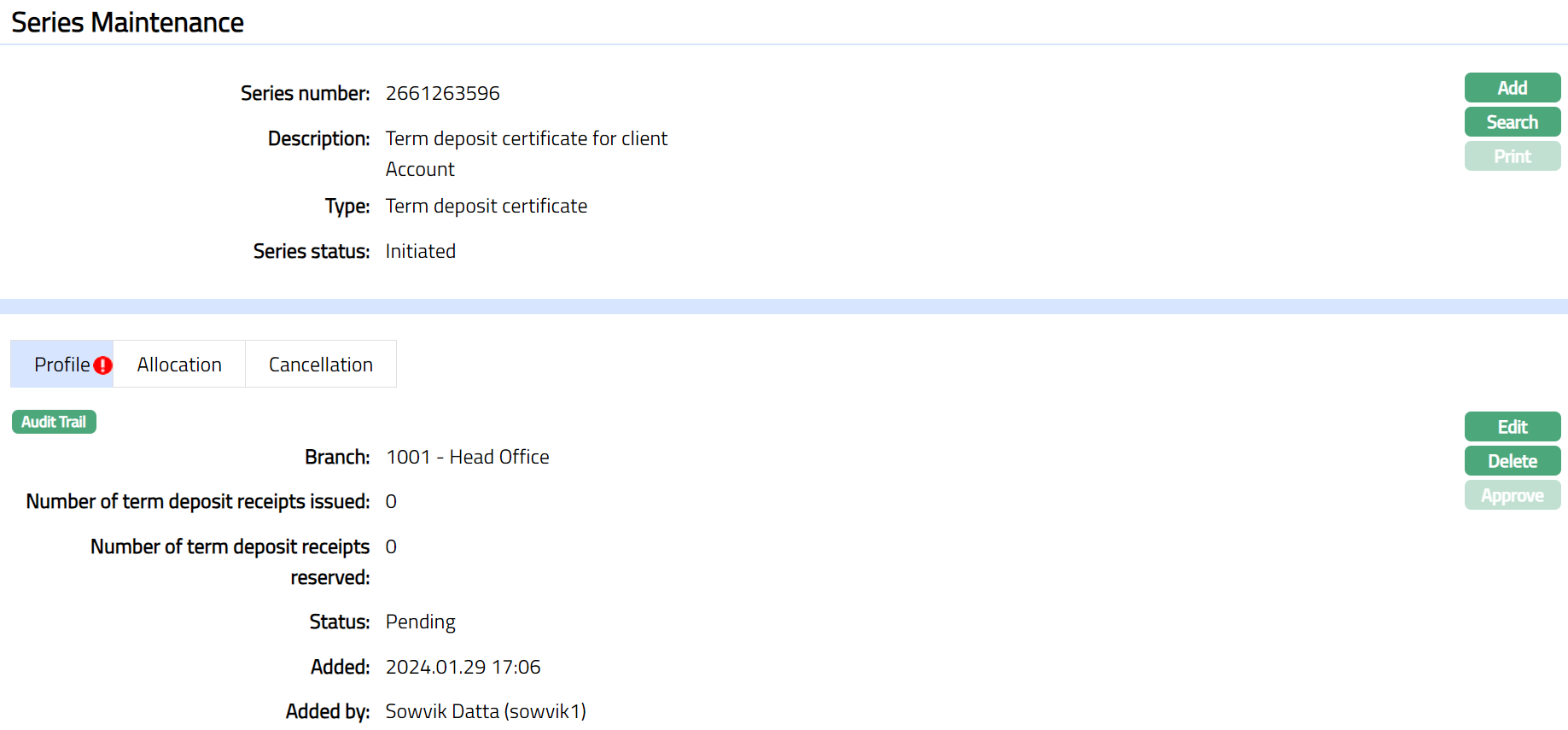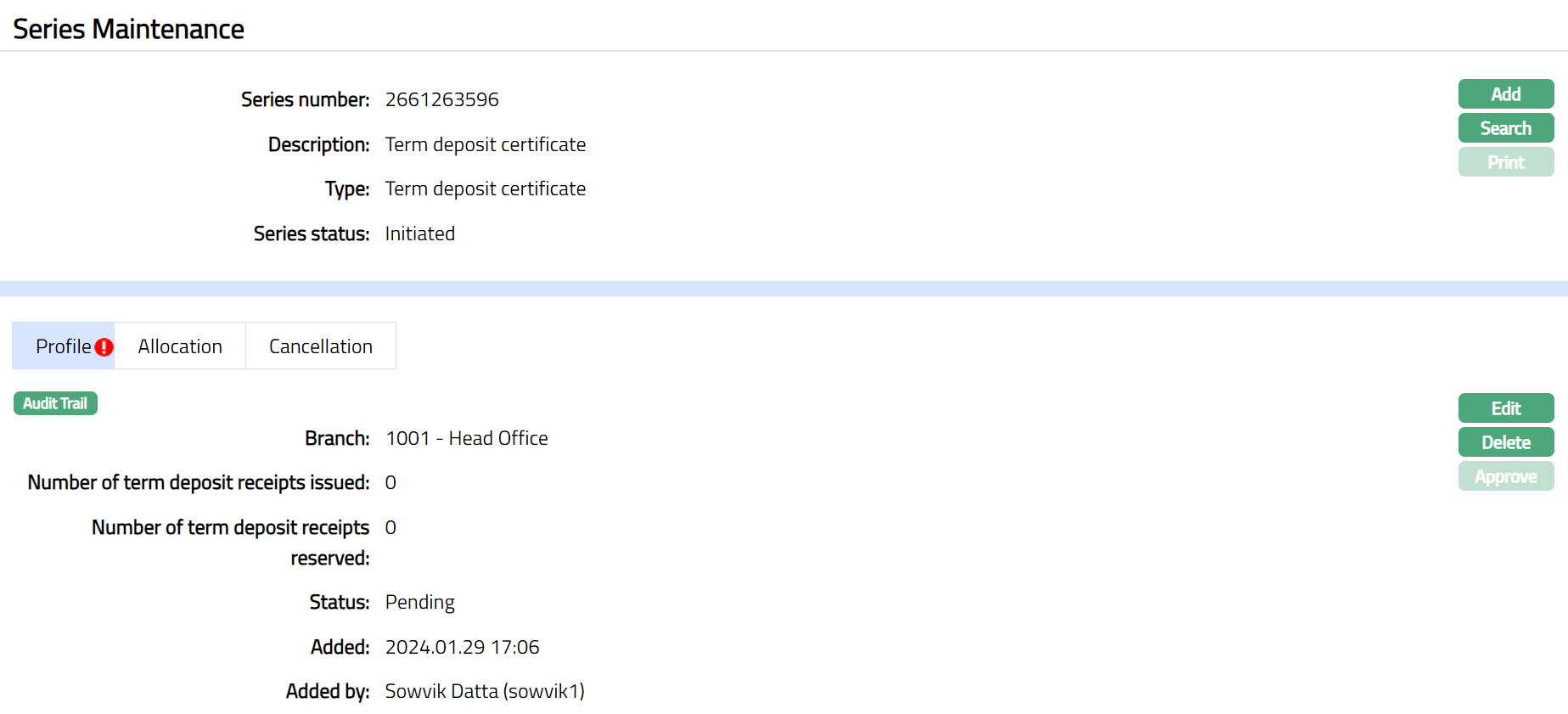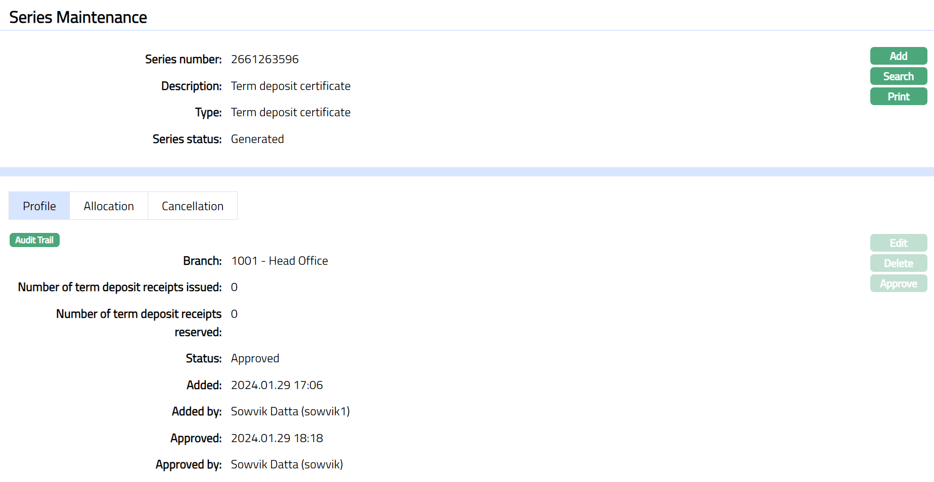 When the record is created and status is Initiated, any user other than the one who created the record can Approve this record. Once Approved status of the Term deposit receipt series is updated to Generated and record status will be Approved. You are allowed to edit the record until this stage.
