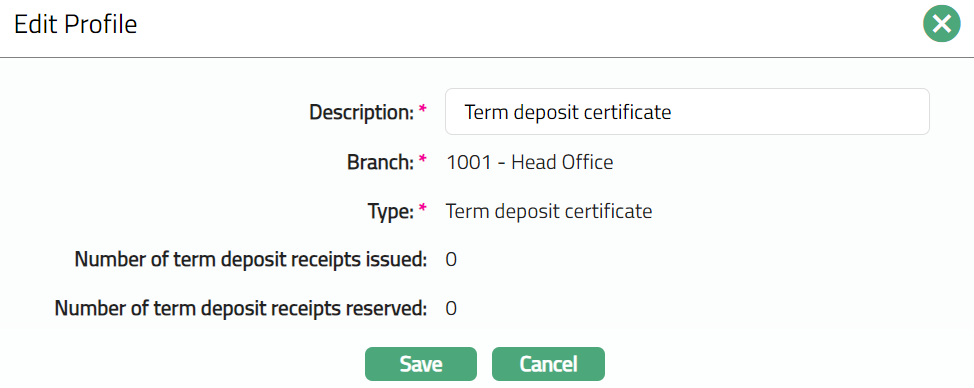 Number of term deposit receipts issued: It denotes the number of term deposit receipts issued till date. By default, value is Zero. It displays the Number of term deposit receipts which have term deposit receipts status as issued and Record status as Approved.