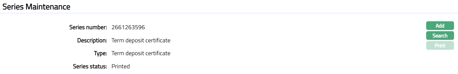 Once status is Printed -- Once status is Printed --The Series status is changed from Generated to Printed. Term deposit receipts with status as Printed are available for issuance.
