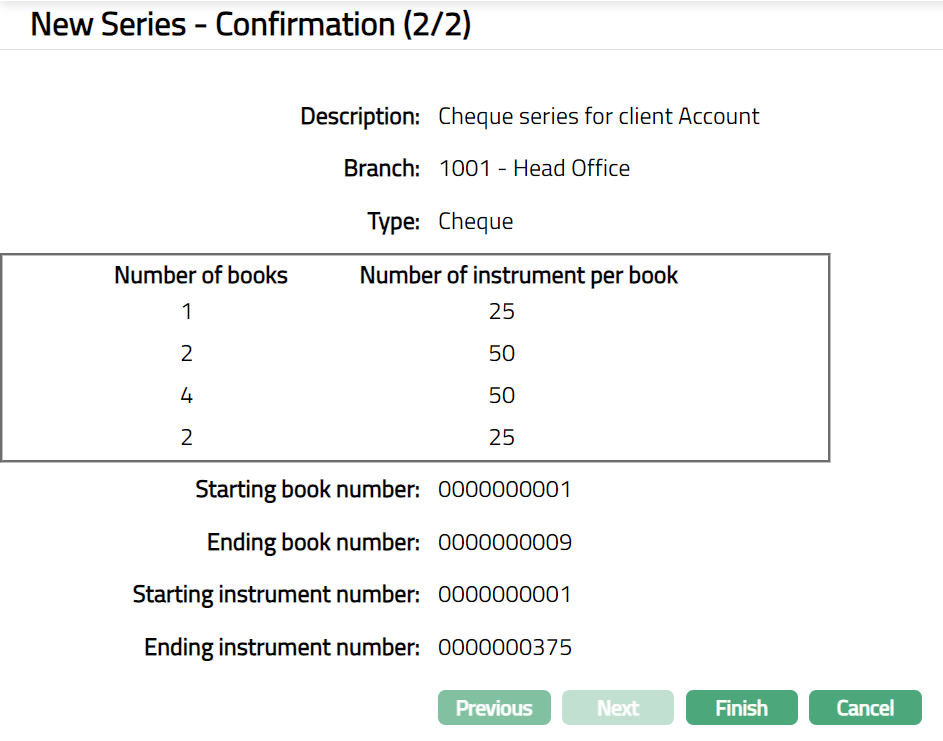 Number of books issued denotes the total number of books in particular series are issued till date. Initially the number of books issued will be 0. When a cheque book is issued for a client and the corresponding record maintained at Retail > Client account > Operations > Cheque book issue is approved, then the value against this field will get updated accordingly.