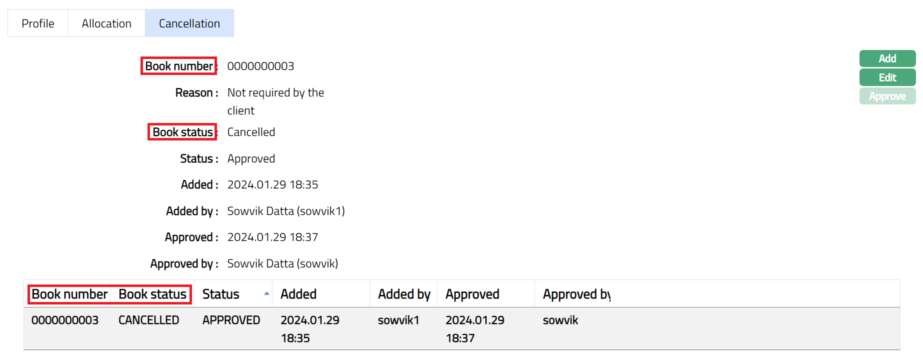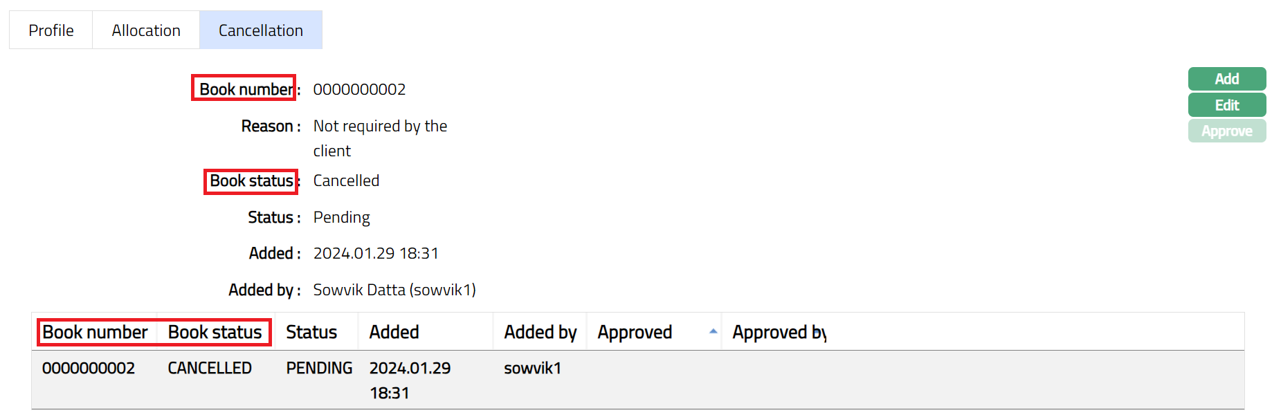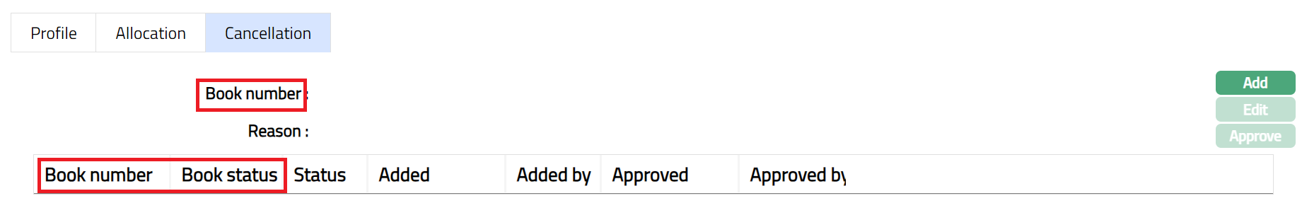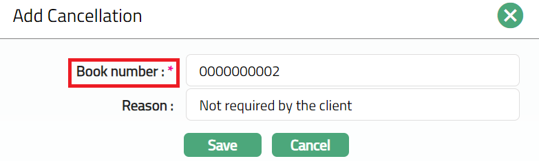 Book number: Enter the required book number you wish to cancel