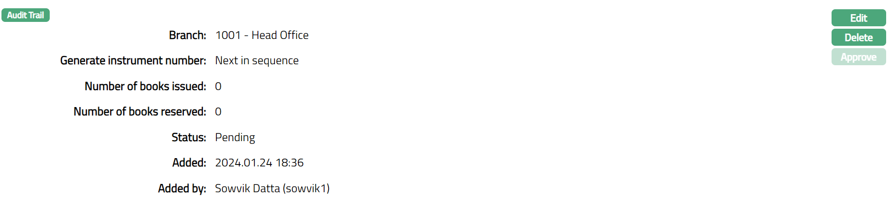 When the record is created and status is Initiated, any user other than the one who created the record can Approve this record. Once Approved status of the cheque series is updated to Generated and record status will be Approved. You are allowed to edit the record until this stage.