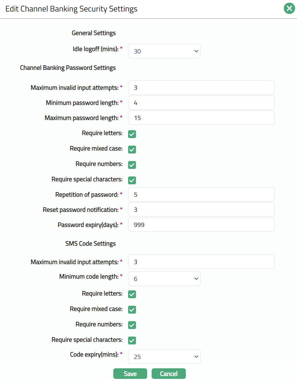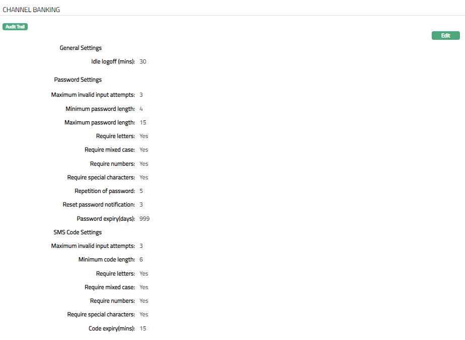 The SMS Code Settings for the Channel Banking User are also similar to the Password Settings. The additional fields are as follows.