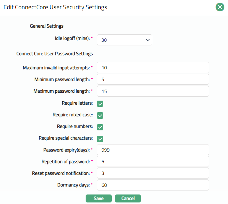 Require Letters - When this box is checked the user must use at least one letter in the password combination. This way of maintaining password will be more secure. During any password reset or change, if the new password does not fulfill the criteria, it will not be accepted as a valid password.