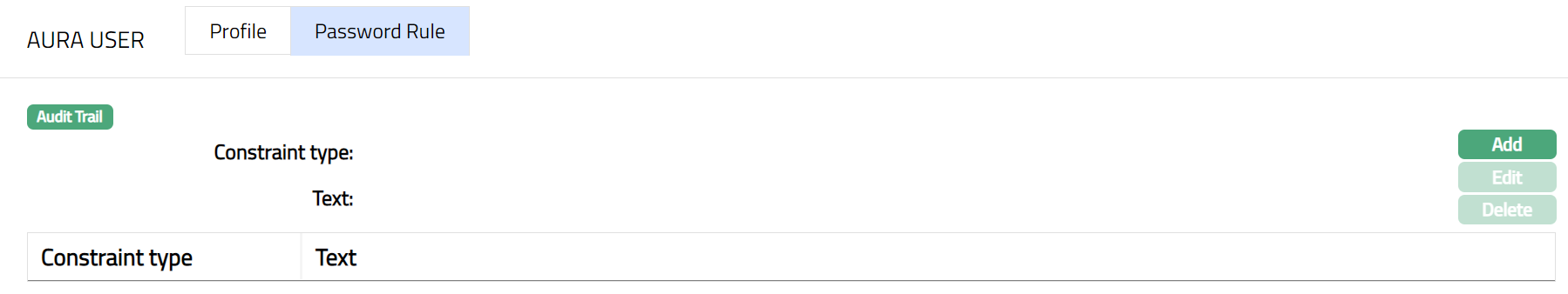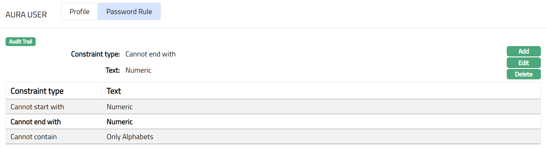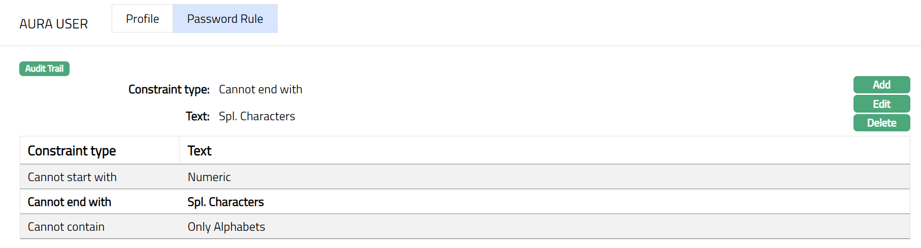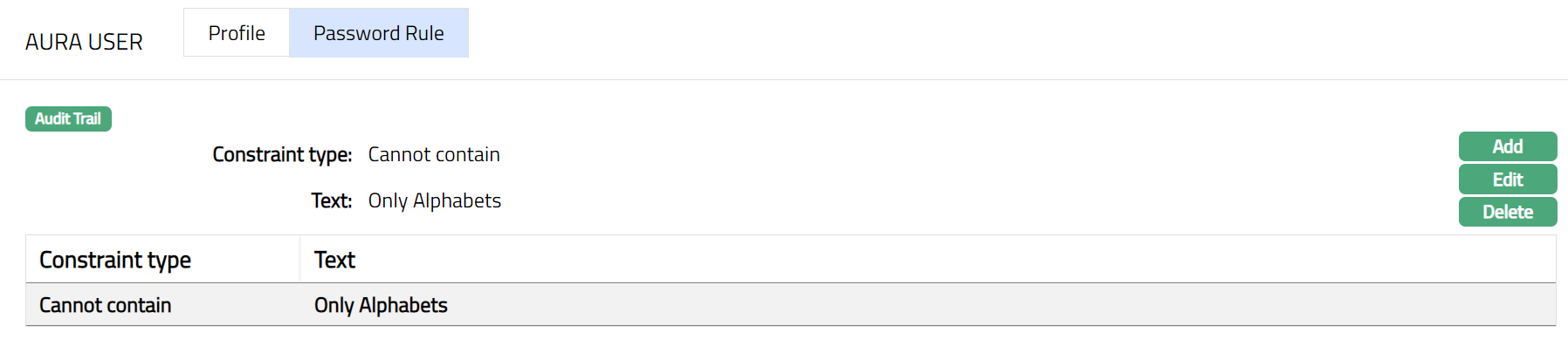 - From Admin menu, click Settings, then Security and then Aura User tab. The System will display the details of existing Security settings under Aura User followed by two subtabs Profile and Password Rule. Note: Profile will be the default subtab under Aura User tab.