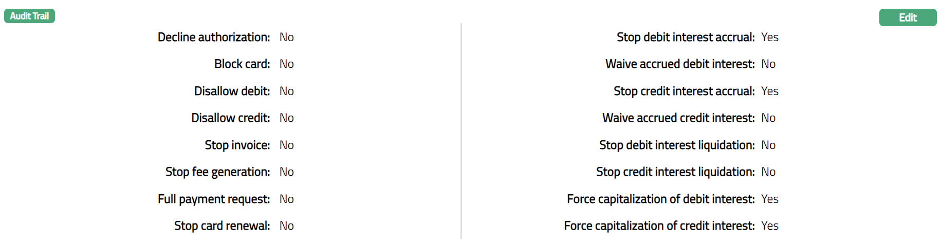 Force capitalization of debit interest: If this flag is marked as Yes, Aura will liquidate the accrued debit interest in the account, when the account moves to this account status. Accrual will however continue if the Stop Accrual flag is not checked. If this field is Yes, Stop debit interest accrual field will be Yes and disabled.