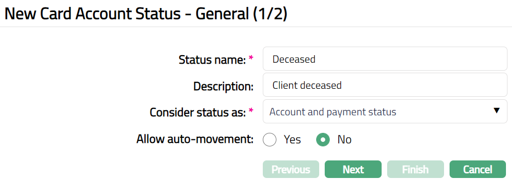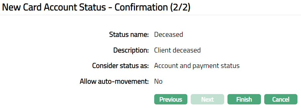 - Click Finish. Card Account Status Maintenance page appears displaying the details of the Status you added. Status of the record is Active.