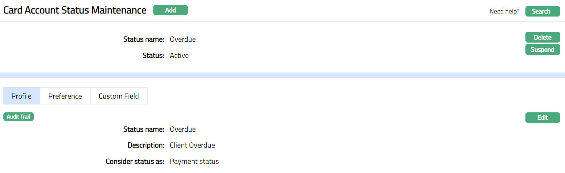 - Access Card Account Status Maintenance page and click Preference tab. Preferences that you see are grouped under separate tabs depending on whether it is defined as an Account Status or Payment Status or both.