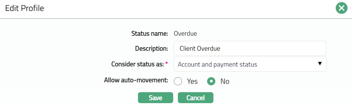 If you have chosen Account Status or Account and Payment Status above, Allow auto-movement is enabled. If an account reaches this status, the Allow auto movement flag will be defaulted into the account from this maintenance. If Allow auto-movement is No, the account status will not automatically move even if the account satisfies the Rules maintained in the product's Rule Builder tab. However, if Allow auto movement is selected as Yes, then the account status will change automatically, as per the Rules in the Rule Builder tab. Note that the Allow auto movement flag in a Billing account enables rules to be applied for the automatic Account status movement, while in the Transaction account, it signifies whether the Account status should move in tandem with the Billing account.