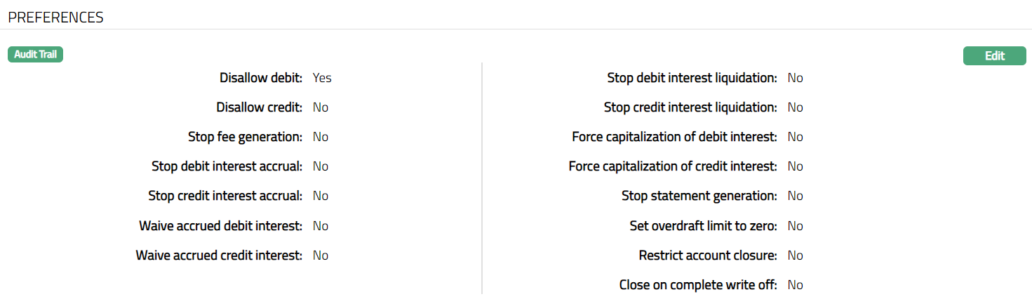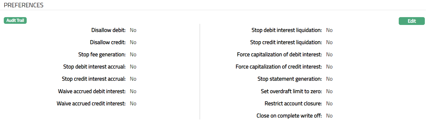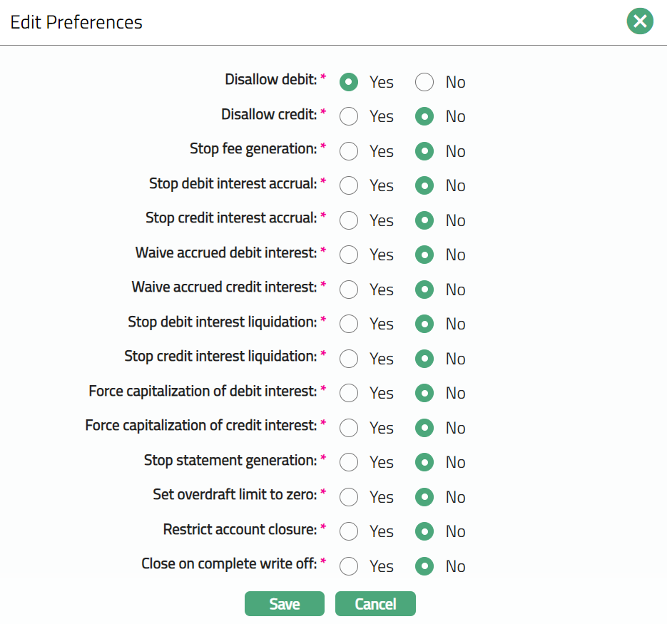 Restrict account closure: If the flag is marked as Yes, then Aura will not allow account closure. If the flag is marked as No, Aura will allow account closure.