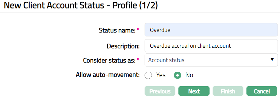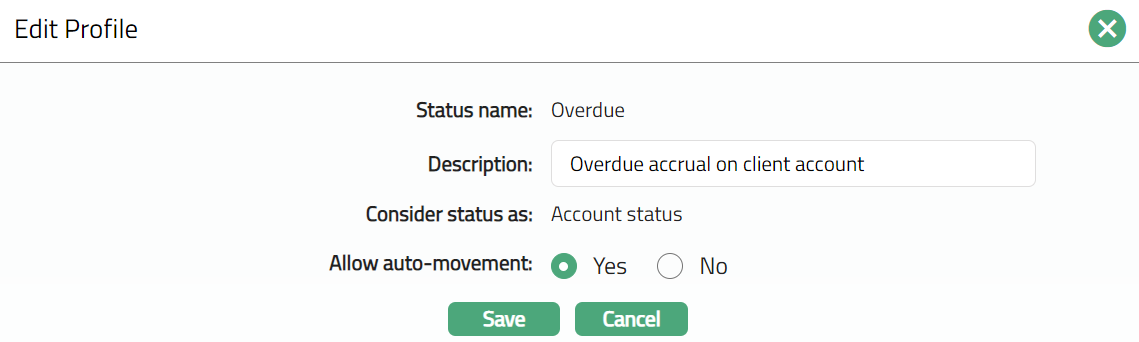 Select option for Allow auto movement; this option will be available only when the Client account status is considered as an Account status or when the Client account status is considered as both Account status and Payment status. When an account reaches this status, the Allow auto movement flag will be defaulted into the account from this maintenance. If Allow auto-movement is No, the account status will not automatically move even if the account satisfies the Rules maintained in the product's Rule Builder tab. However, if Allow auto movement is selected as Yes, then the account status will change automatically, as per the Rules in the Rule Builder tab.