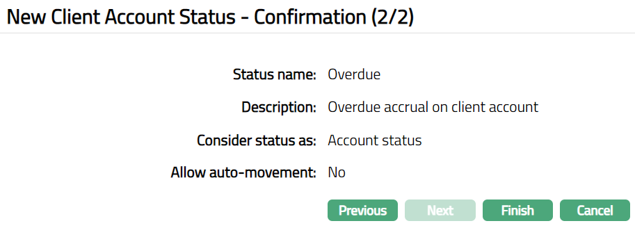 - Click Finish. Client Account Status page appears displaying the details of the Status you added. Status of the record will be Active.