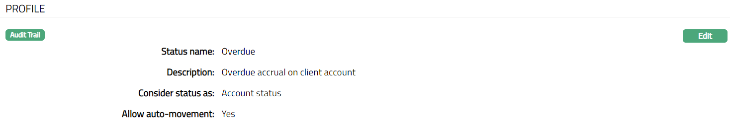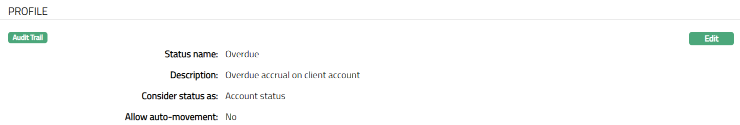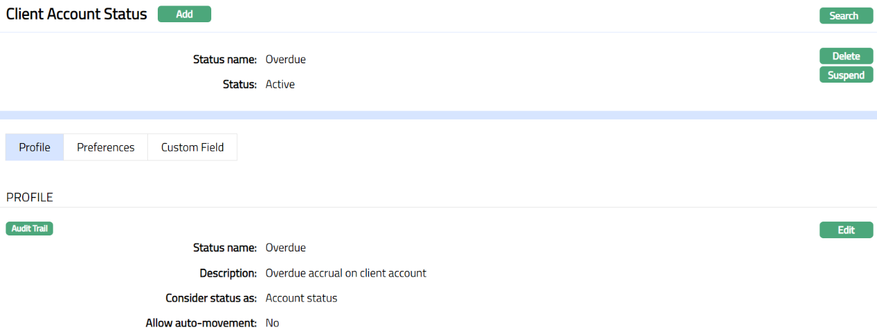 Profile tab, which is the default tab in the Client Account Status screen, shows the basic Status details which were added in New Client account Status -- Profile (1/2).