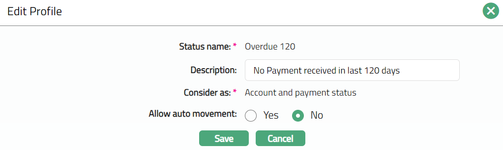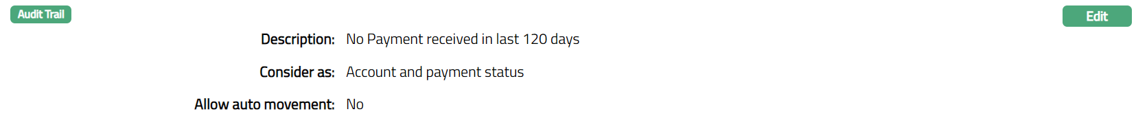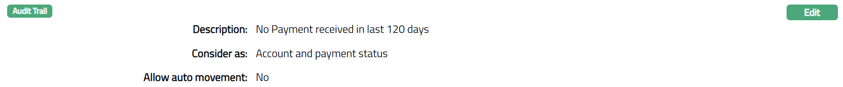Select Yes or No radio button for Allow auto movement. When an account reaches this status, the Allow auto movement flag will be defaulted into the account from this maintenance. If Allow auto-movement is No, the account status will not automatically move even if the account satisfies the Rules maintained in the product's Rule Builder tab. However, if Allow auto movement is selected as Yes, then the account status will change automatically, as per the Rules in the Rule Builder tab.