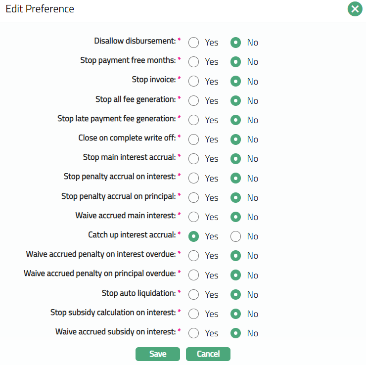 Preference tab allows you to maintain the corresponding preferences that will apply to accounts which fall into the specific Loan status. Flexibility is provided in enabling or disabling specific preferences on accounts that reach a specific status.