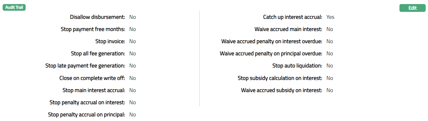 | Yes | No | If main accrual is stopped, then Catch up main interest accrual is set as No and will be in disabled mode. |