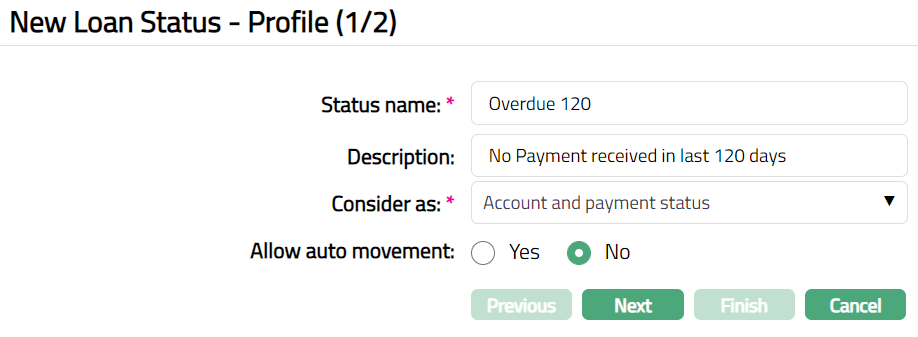 - Click Add. New Loan Status - Profile (1/2) page appears.