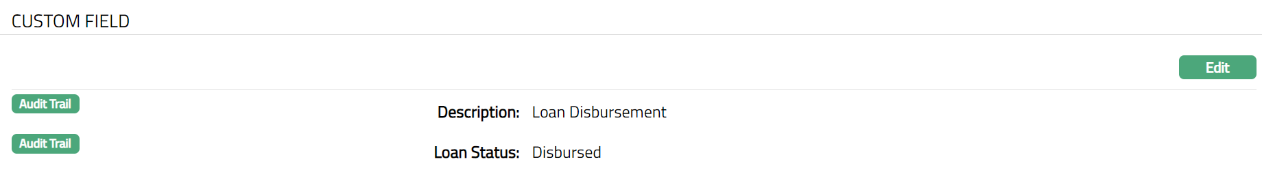 Using the Custom Field tab, you can maintain the custom fields mapped to the Loan Status. Depending on the custom fields created and mapped to Loan Status (using Admin > System Codes > Custom Fields), the fields will be displayed on this tab.