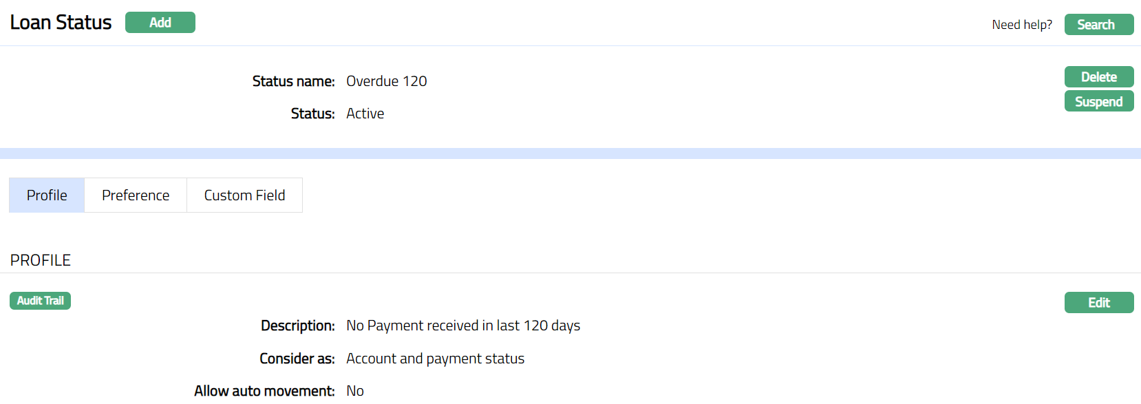 Profile tab, which is the default tab in Status screen, shows the basic Status details which were added in New Loan Status -- Profile (1/2).