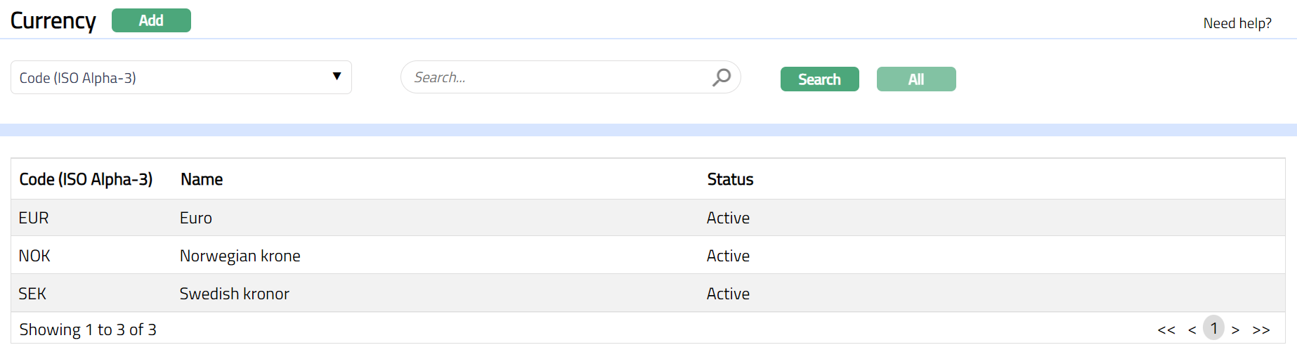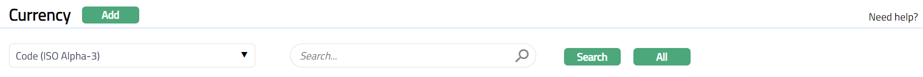1. From Admin menu, click System Codes, Currency, and then Currency. All currencies available in Aura appear on the page, sorted alphabetically based on their ISO Alpha-3 codes.