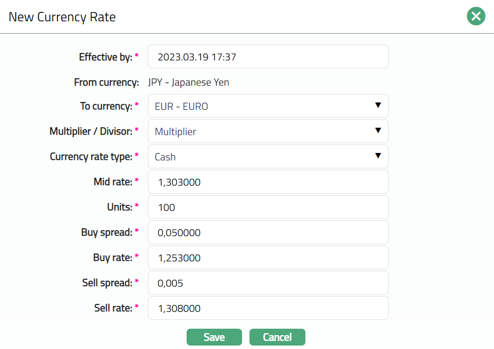 Consider for example the exchange rate for 100 JPY = 1.303000 EUR. If you have chosen the mathematical method as Multiplier, you must maintain 1.303000 as mid rate and units as 100 for the currency pair JPY: EUR as shown below: