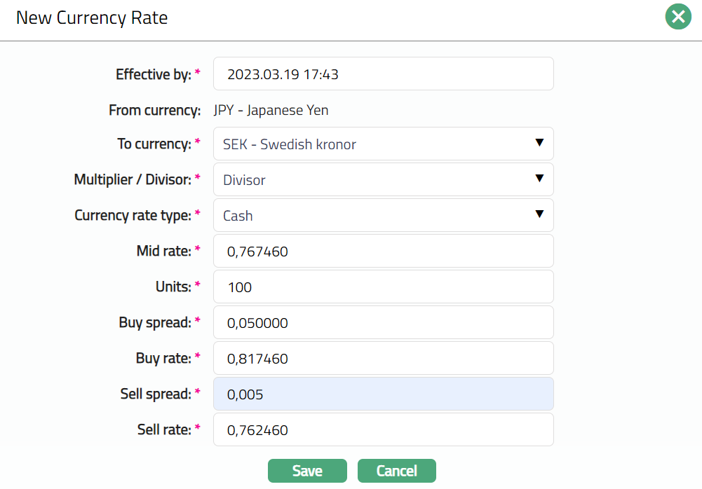 14. Enter the rate in the Sell rate box, the rate at which your bank sells the To currency against the From currency. If you enter the Mid Rate and the Sell Spread, Aura computes the Sell Rate based on the Multiplier / Divisor option specified