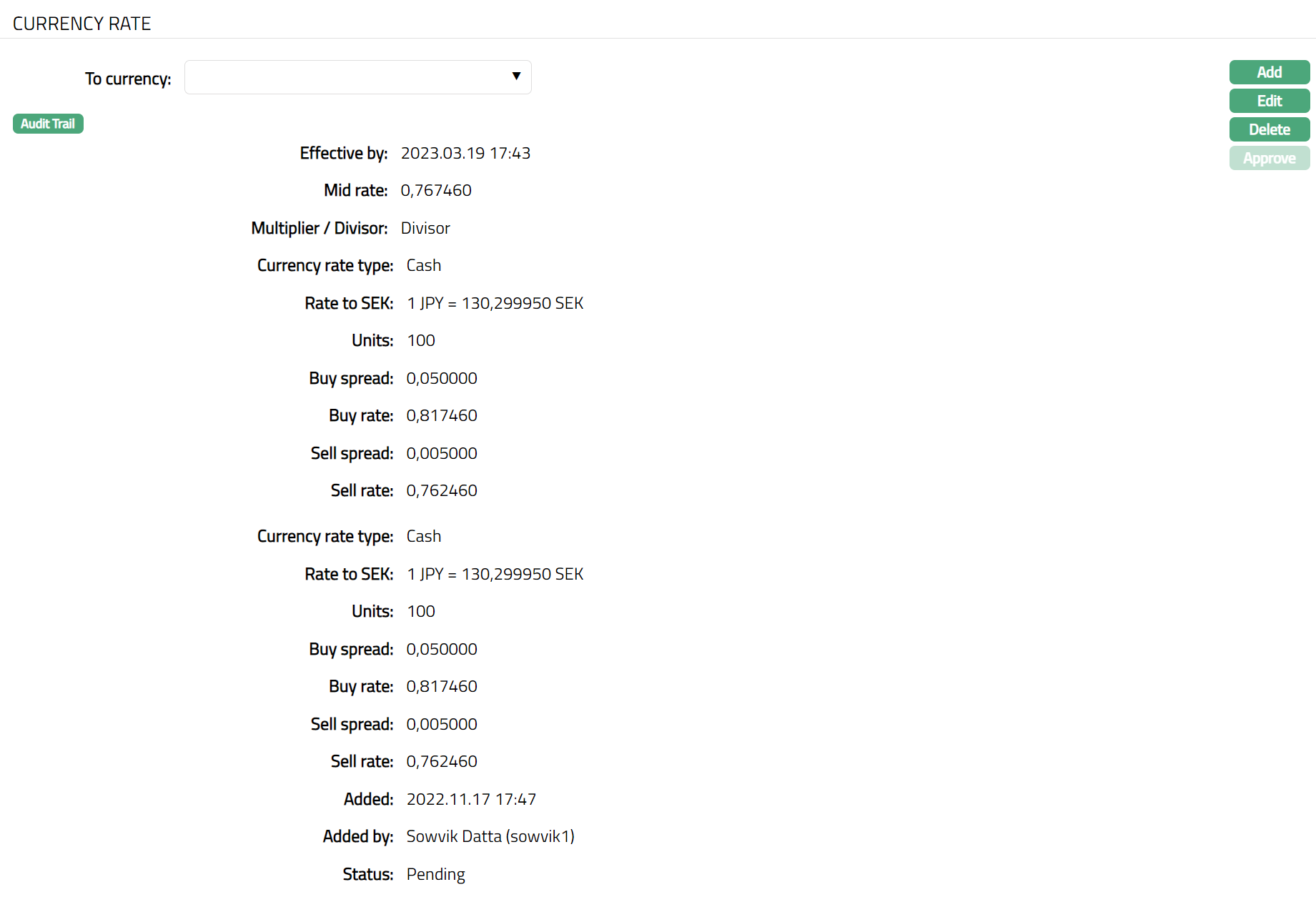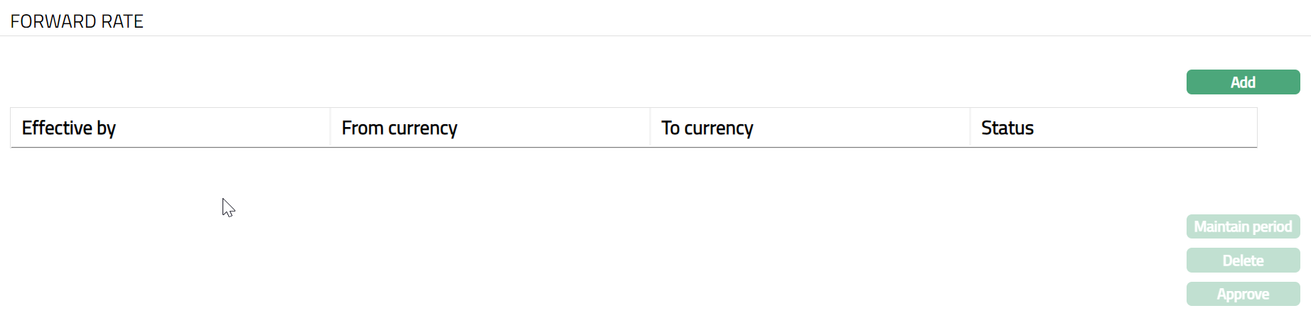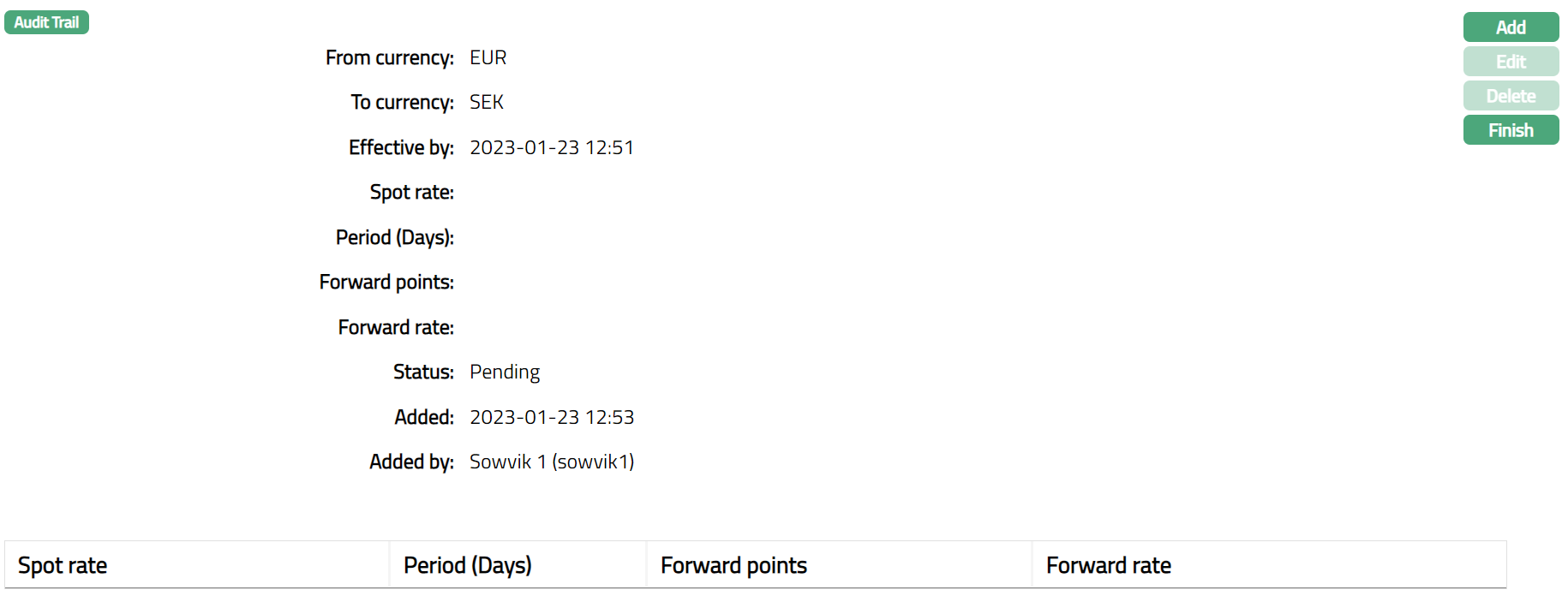 Note: The Forward Rate record status is set to Pending till it is approved by another user. On approval, the record status is set to Approved. Till it is Approved, the rate cannot be used elsewhere.