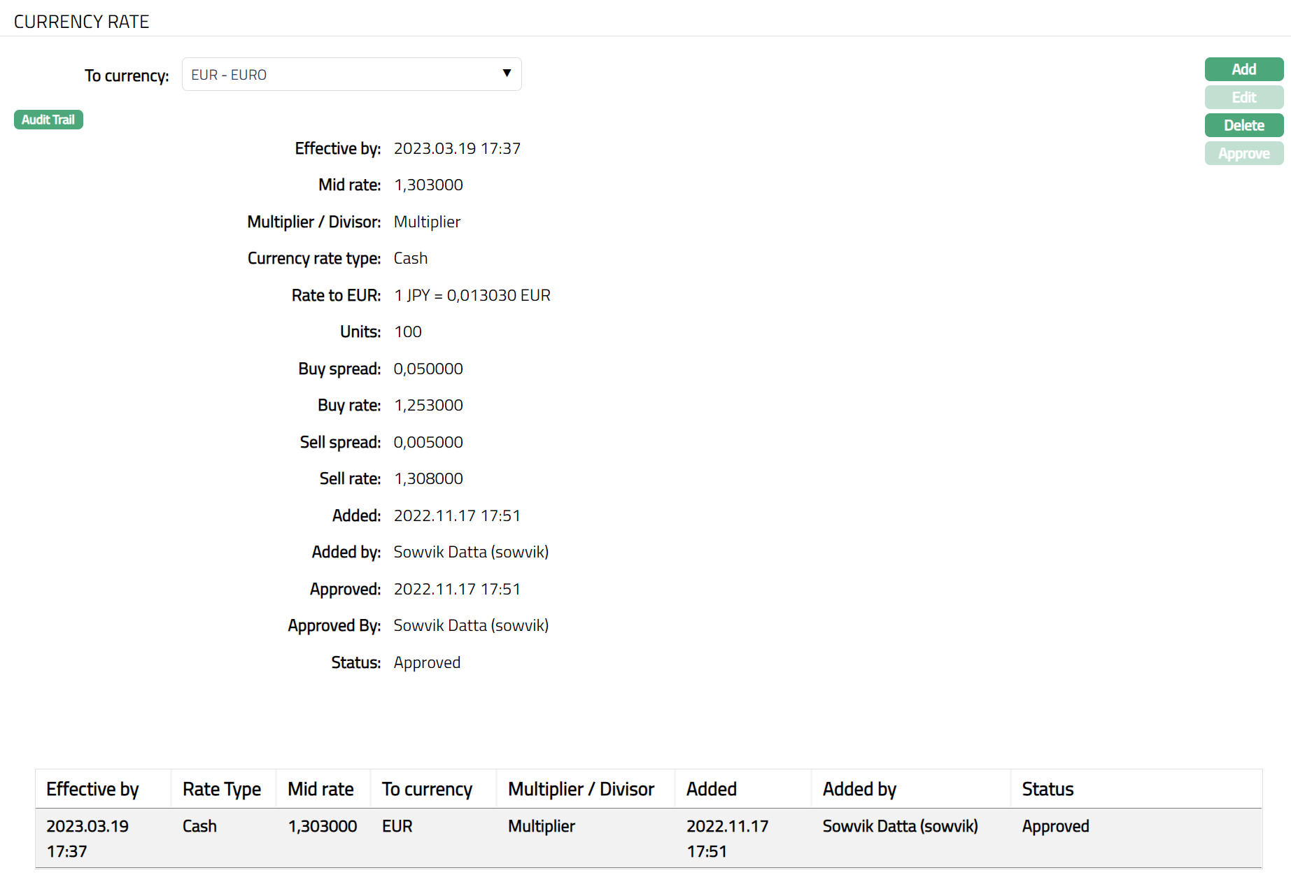 In the currency rate view page, Aura displays the Mid-rate as per the following logic: a) If you have maintained the mathematical method as Multiplier, Units as 100 and mid rate of 1.3030000 for the currency pair JPY: EUR, Aura will display the Mid rate as 100 JPY = 1.303000 EUR