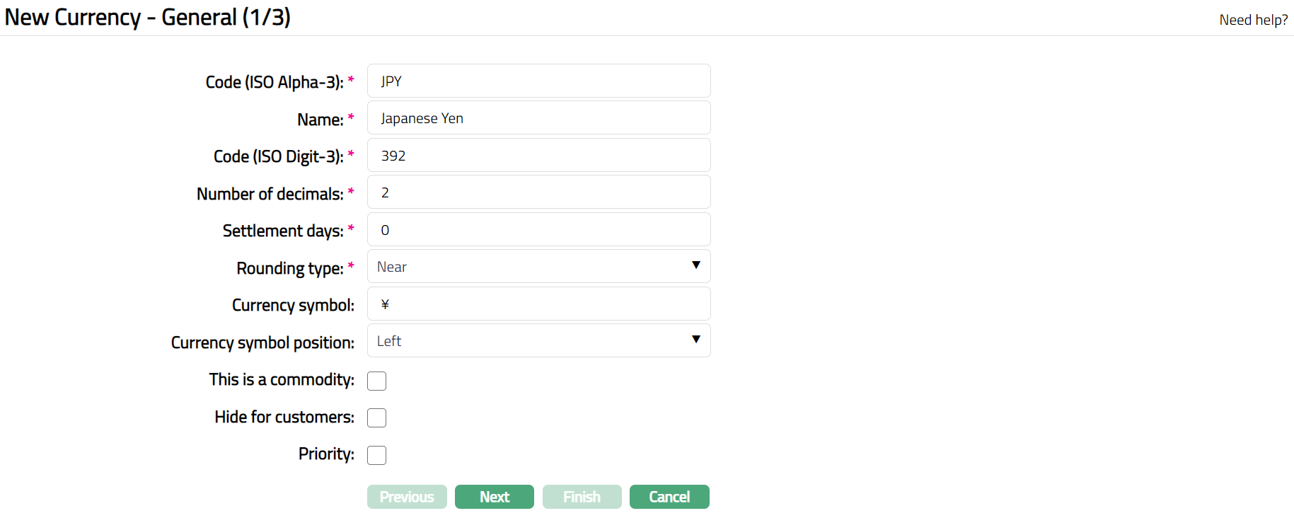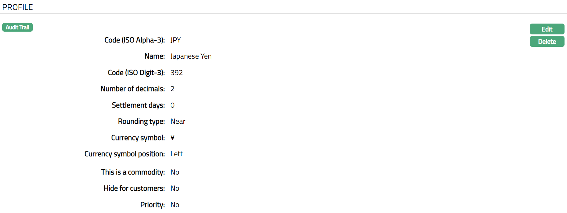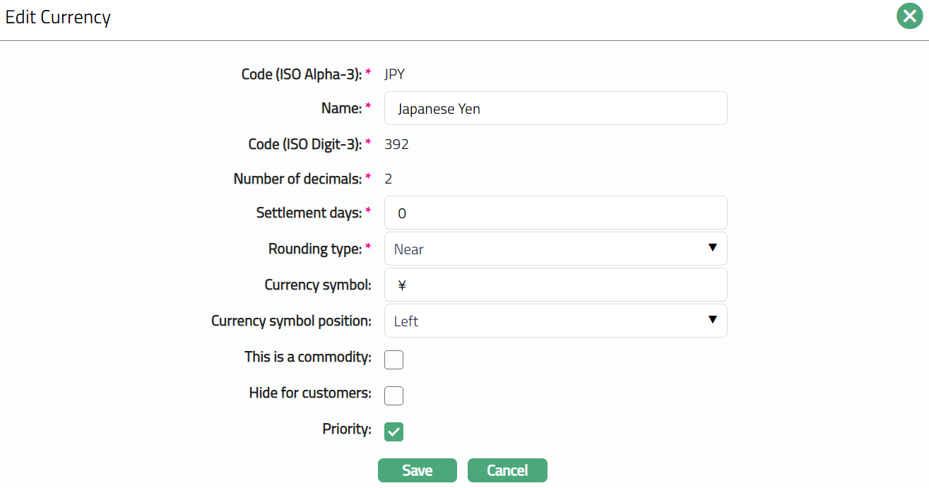 Note: Except Code (ISO Alpha-3), Code (ISO Digit-3) and Number of decimals, all other fields are editable.