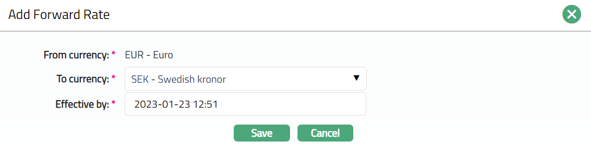 6. Select To Currency to which the forward rate would be applicable from the drop-down list, . Aura will display the currencies maintained under General ledger > Settings > Currency whose status is Active.