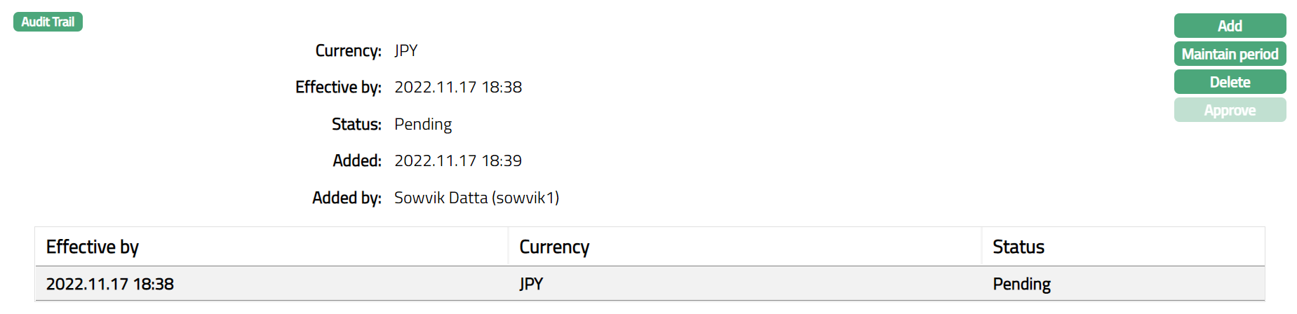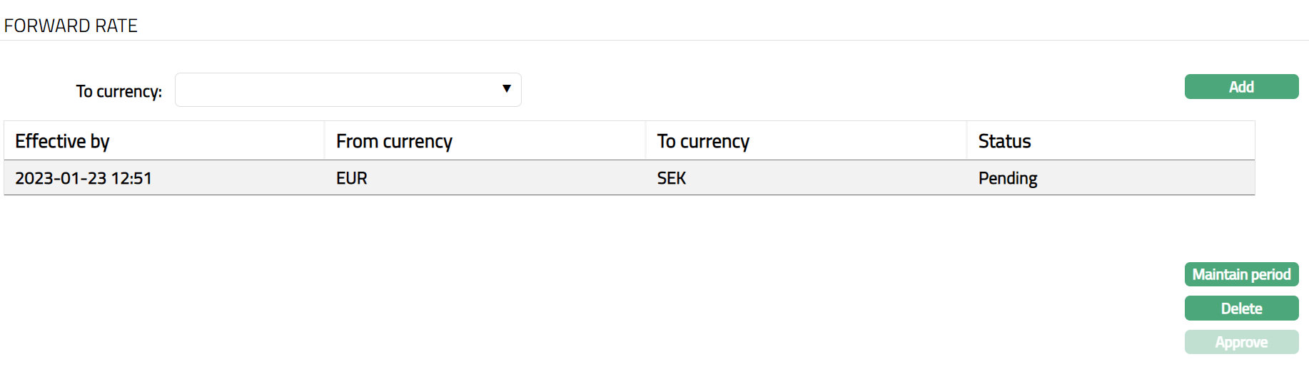 15. Click Save. The Maintained period page appears displaying the list of Period, Forward rate and Forward point updated for the currency for the Effective by date displaying the Status as pending.