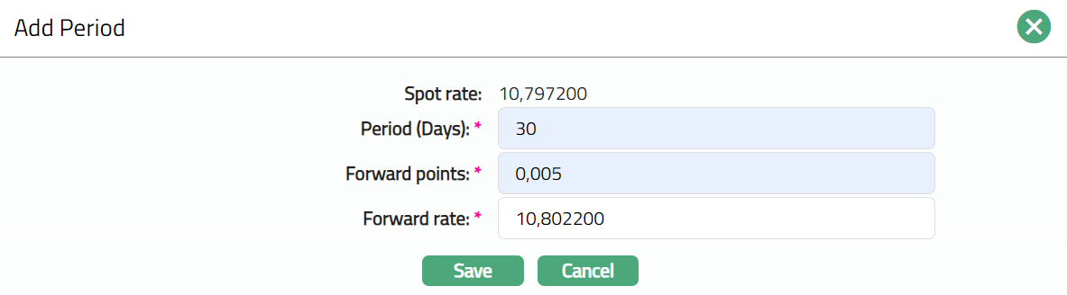12. Enter Period (Days) for which the Forward rate will be effective. For example, enter 30.
