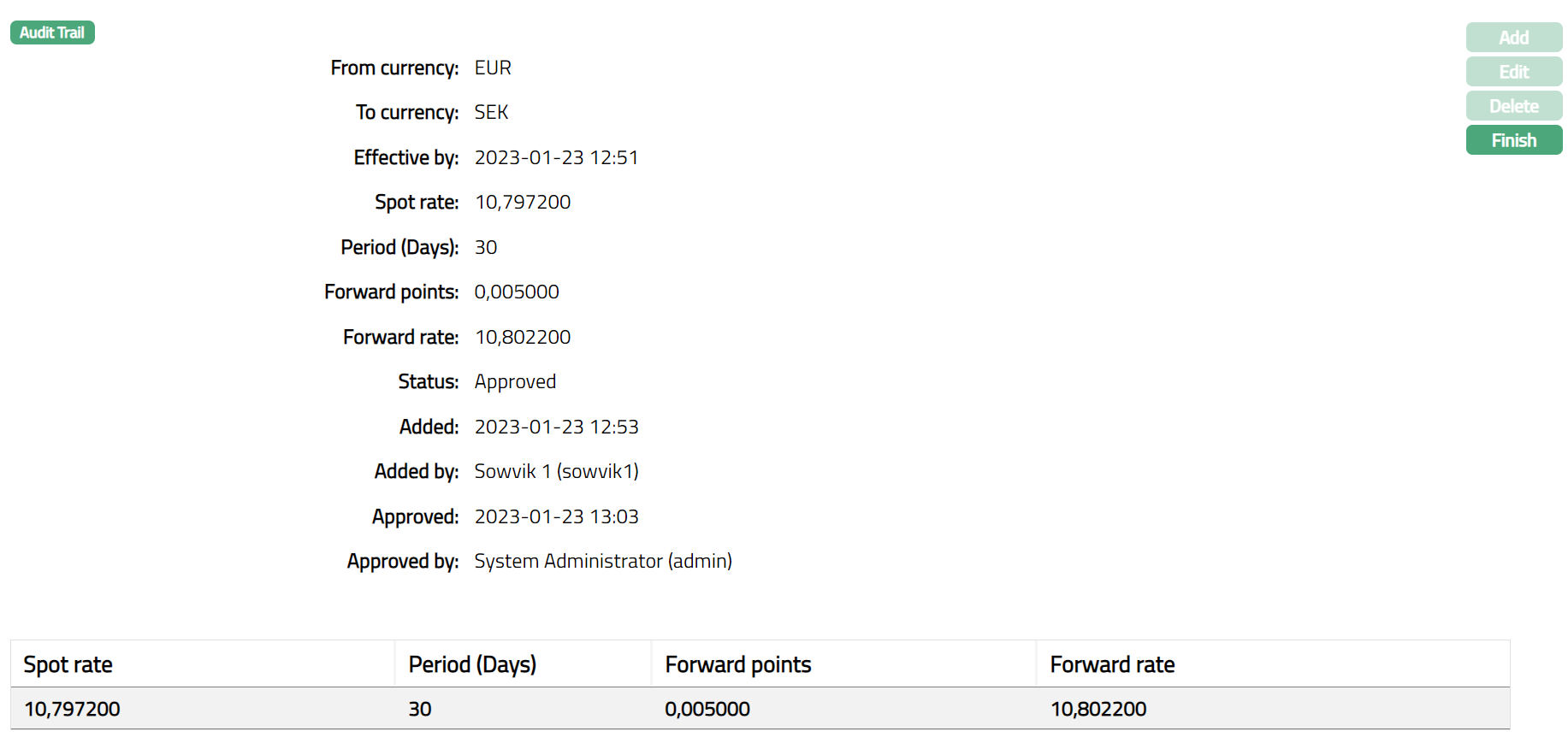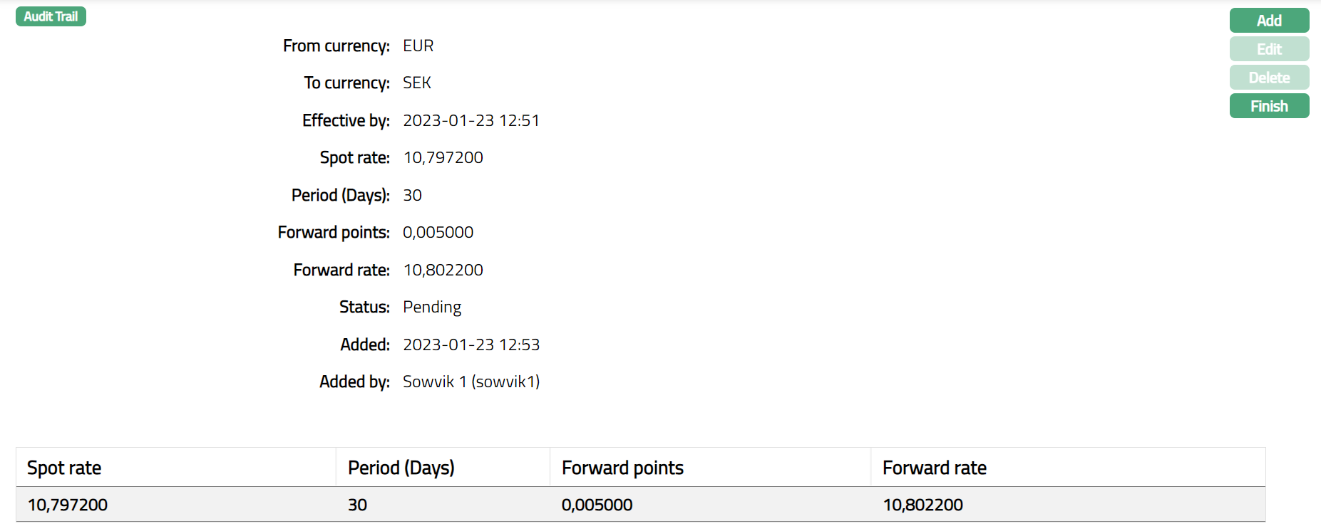 16. Click Finish. Forward Rate page appears displaying the details of the forward rate currency pairs.