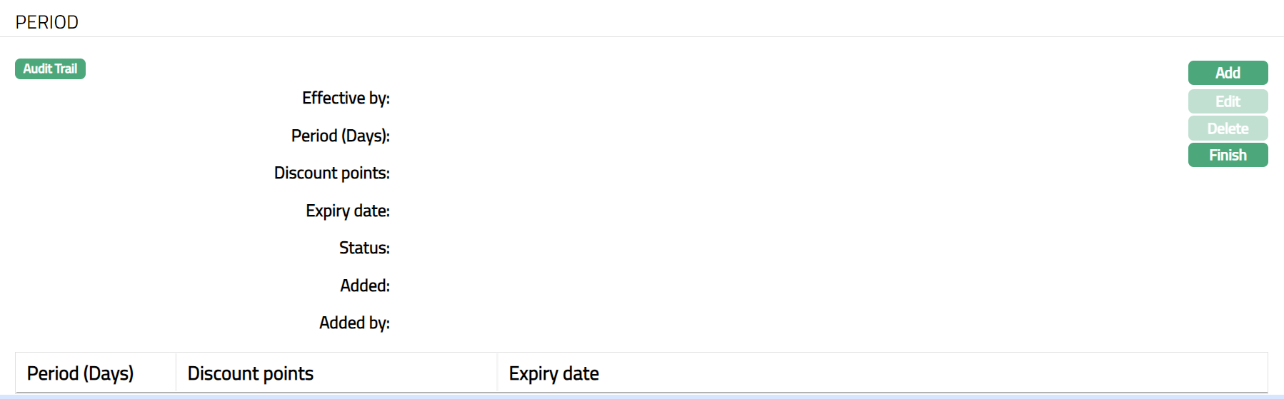 To maintain the details of the Period (Days) for which the Discount rate is applicable, click on the Maintain period button. You can maintain the Discount rate for multiple periods for the same effective date.