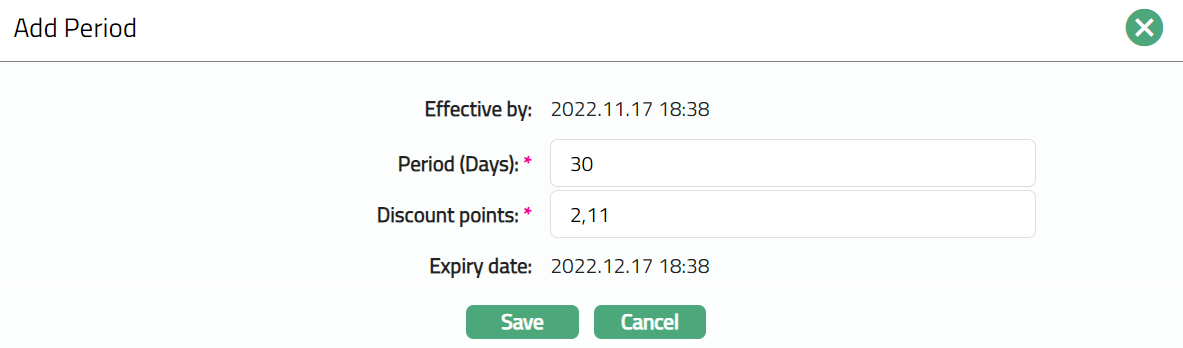 10.Enter Period (Days) for which the Discount rate will be effective. For example, enter 30.