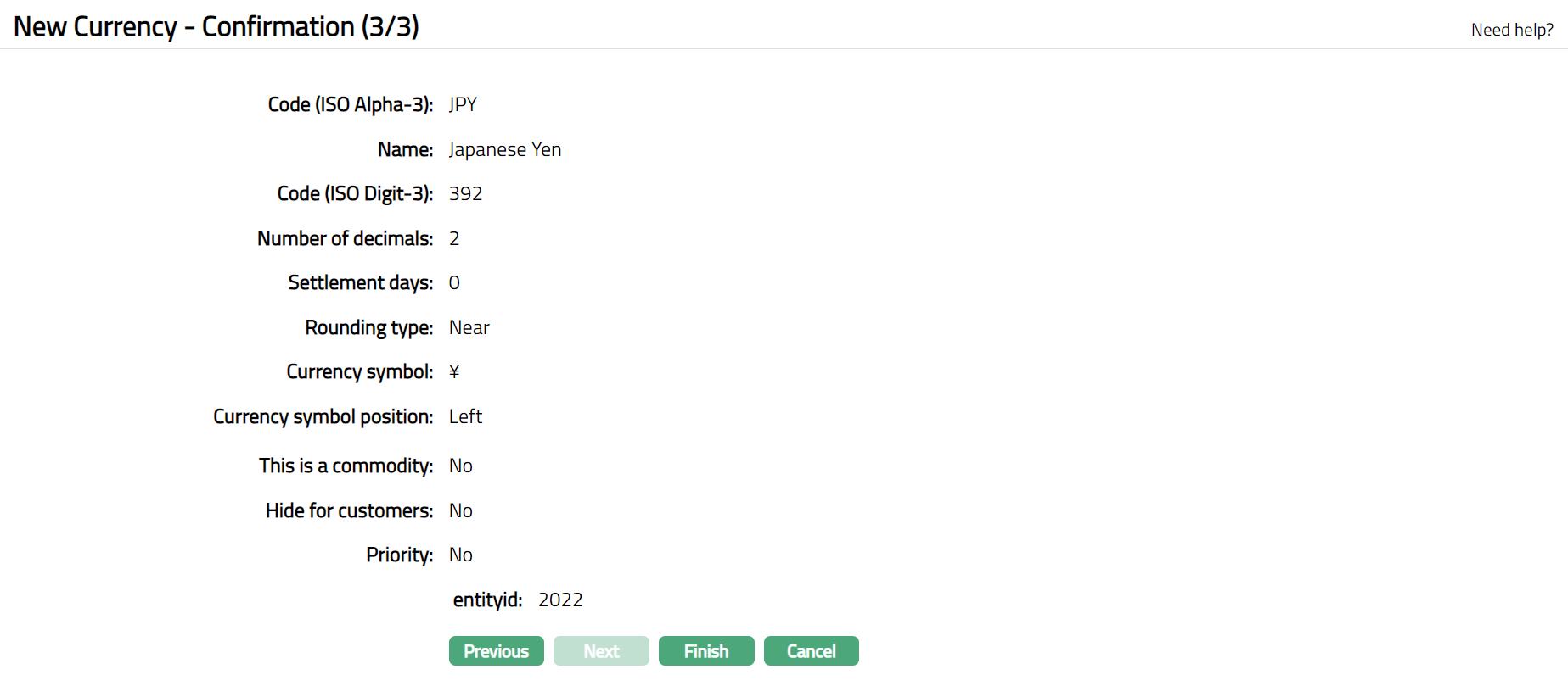 16. Click Next. New Currency → Confirmation (3/3) page appears.
