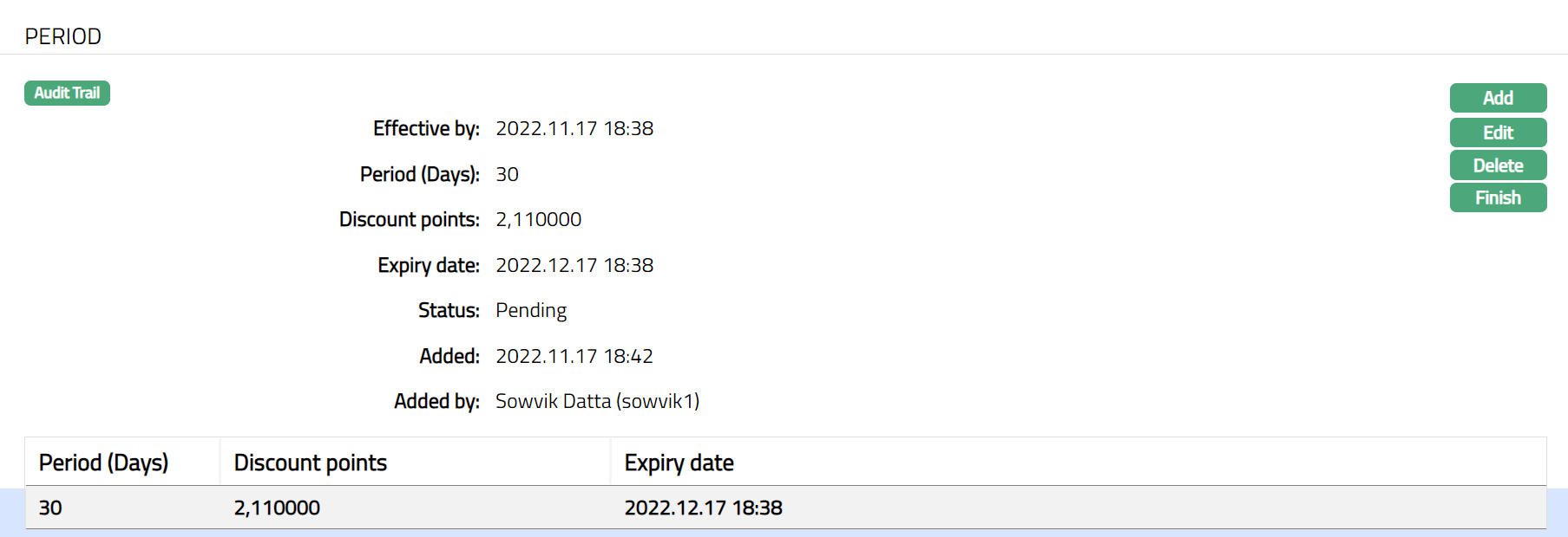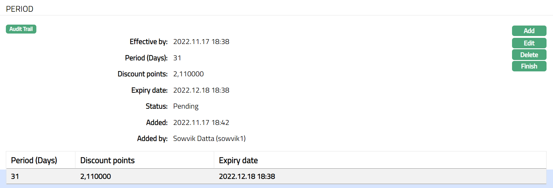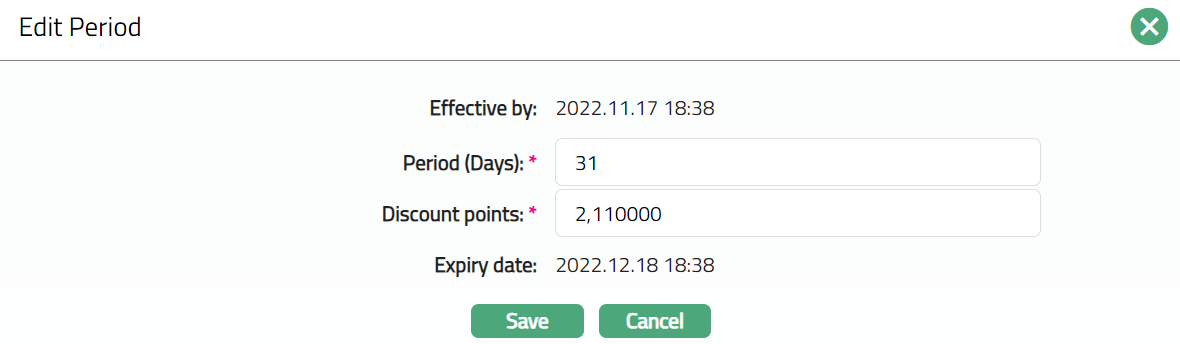 13. Click Save. The Period page appears displaying the list of periods, discount rate and expiry date updated for the currency for the Effective by date.