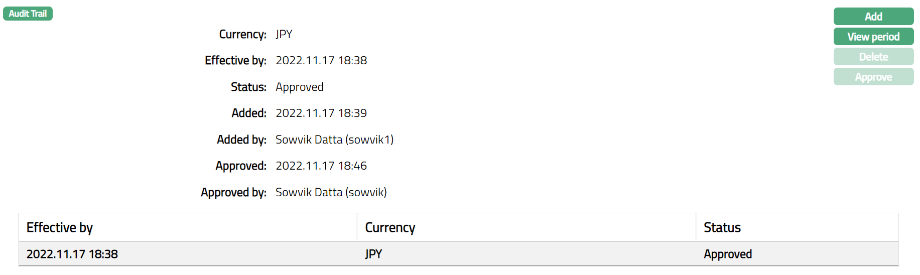 Note: The Period record status is set to Pending till it is approved by another user. On approval, the record status is set to Approved. Till it is Approved, the rate cannot be used elsewhere.