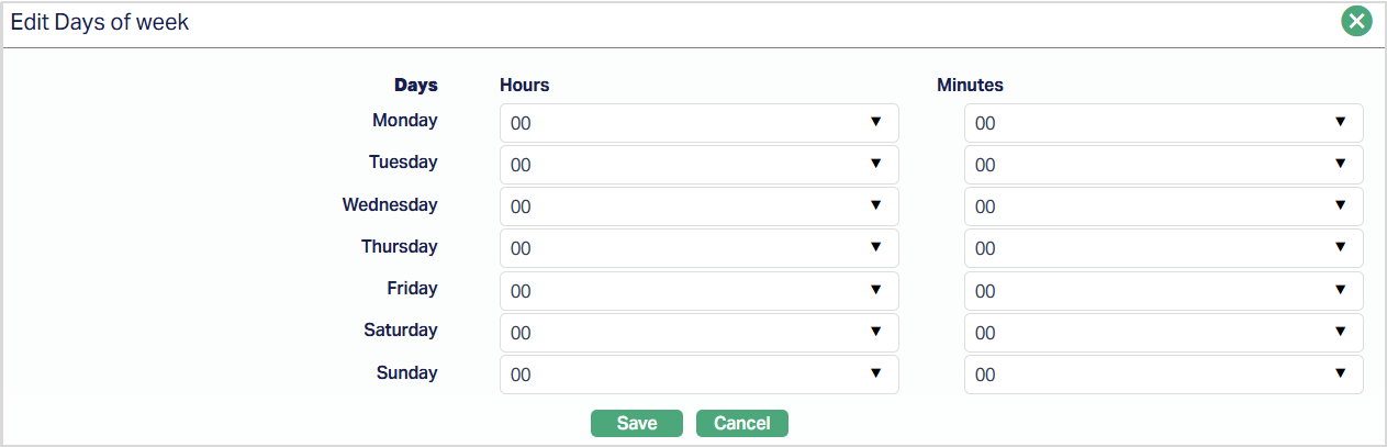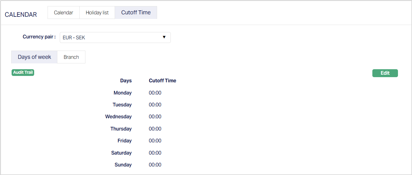 The Days of week tab displays the cutoff time maintained for each day of the week for the selected currency pair. The default cutoff time is 00:00 for all days when a new currency pair is created.
