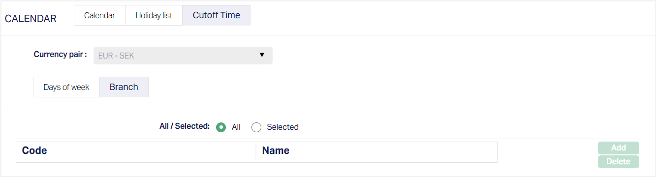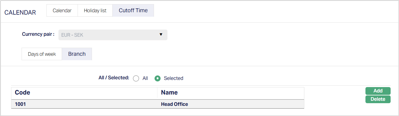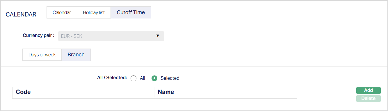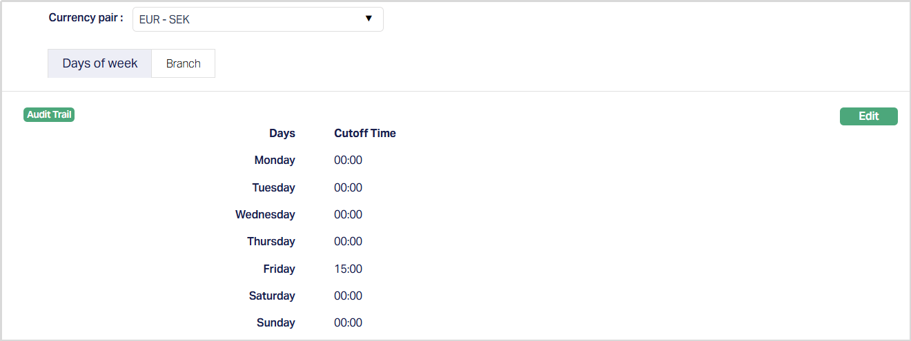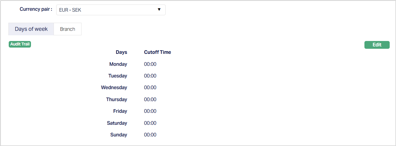 After you select the currency pair from the drop-down list, Aura displays the Days of week and Branch sub-tabs. Sample screenshot is shown below.