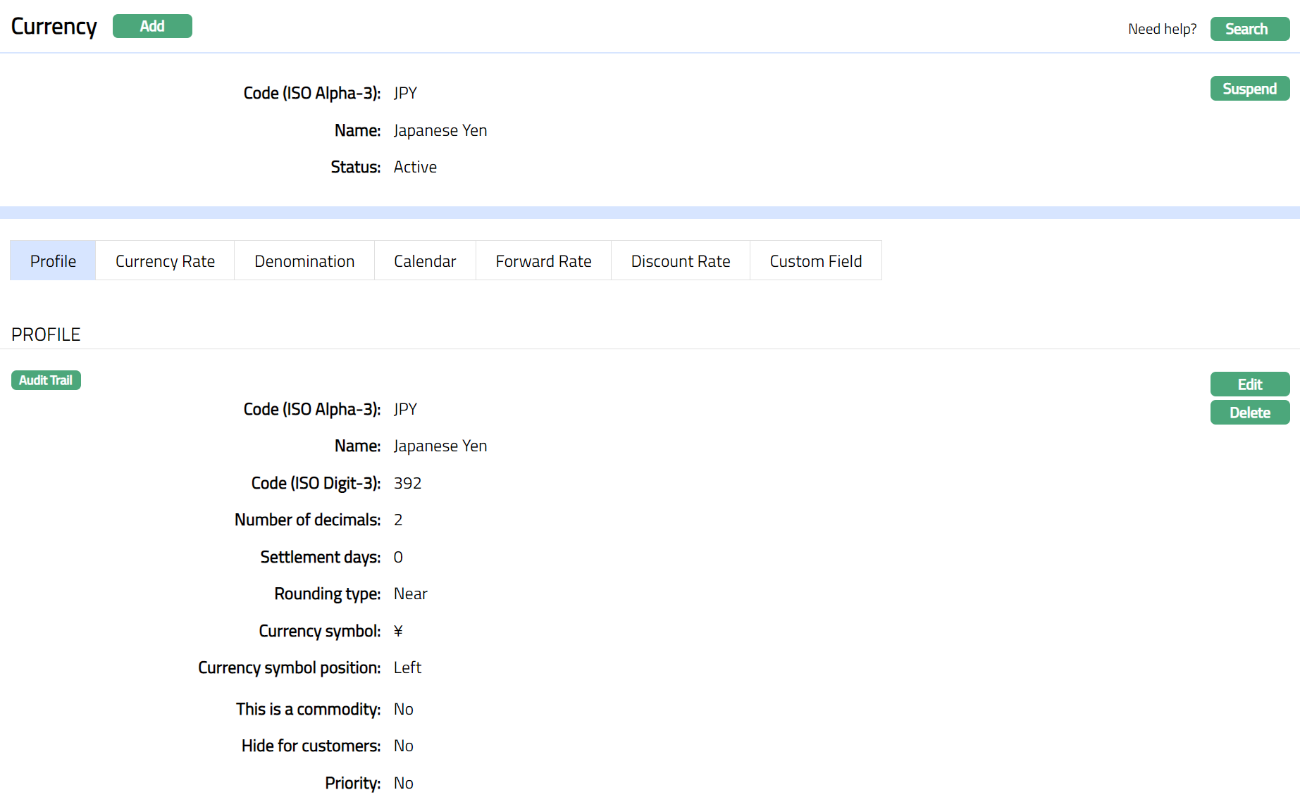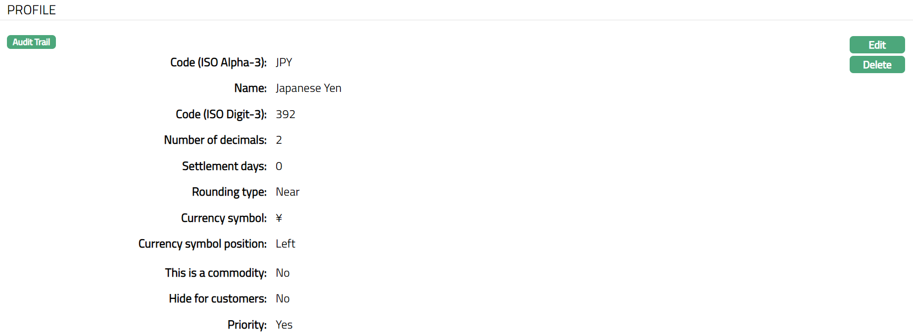 17. Click Finish. Currency page appears displaying the Profile tab by default with the details of the currency you added.