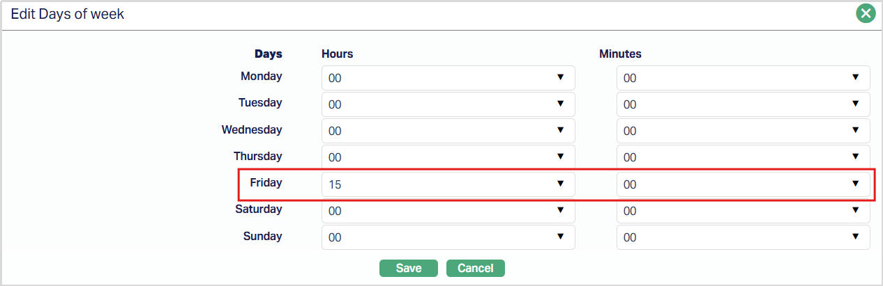 Earlier cut-off time of Fridays - If your bank processes international transactions only until the afternoon on Fridays, you can update Friday’s cutoff time to 15:00. Sample screenshot is shown below.