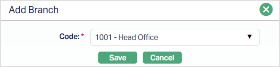 3. Select the required branch from the Code drop-down list. Aura displays the list of active branches maintained under Admin > Branches.