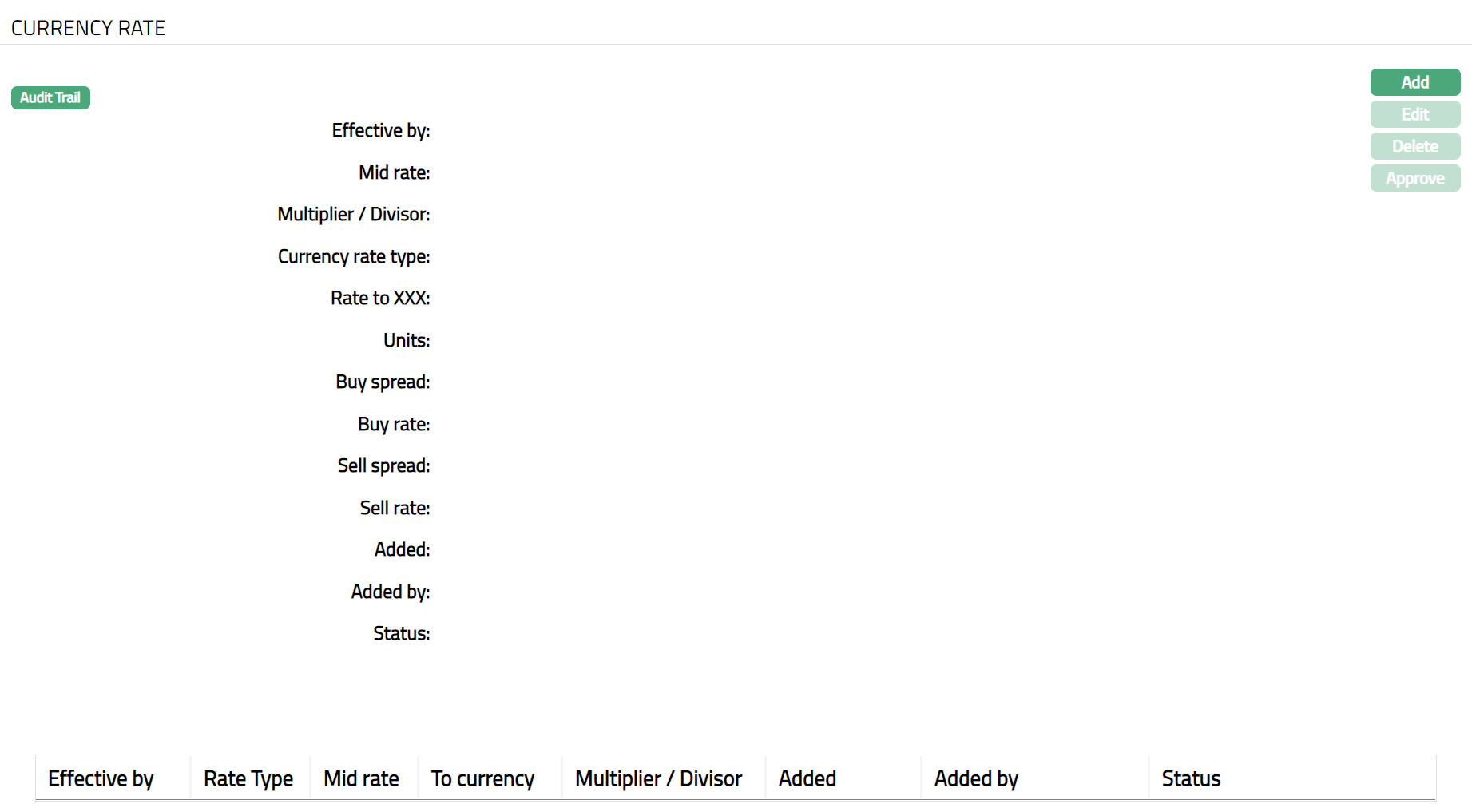 12. Enter the rate in the Buy rate box, the rate at which your bank buys the To currency using the From currency. If you enter the Mid Rate and the Buy Spread, Aura computes the Buy Rate based on the Multiplier / Divisor option specified.