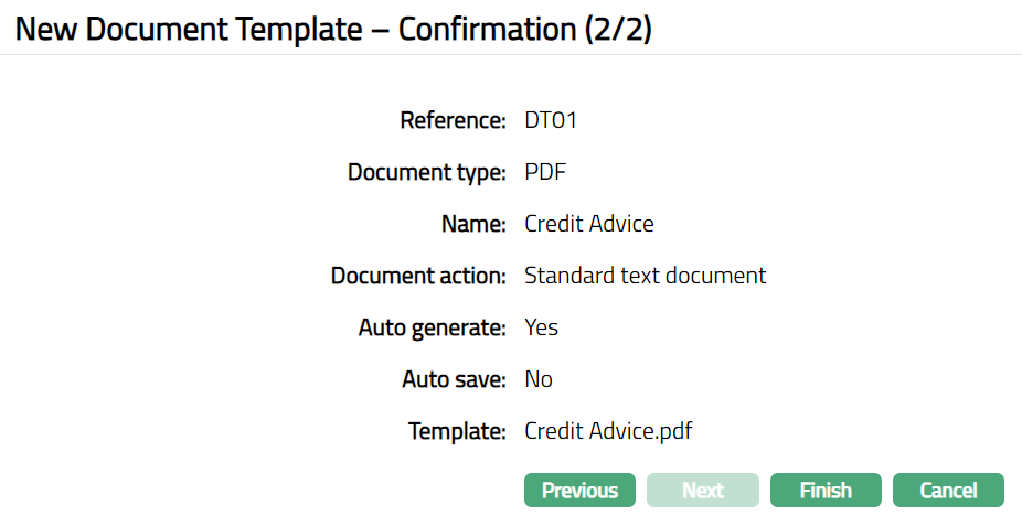 Click Next. New Document Template -- Confirmation (2/2) page appears.